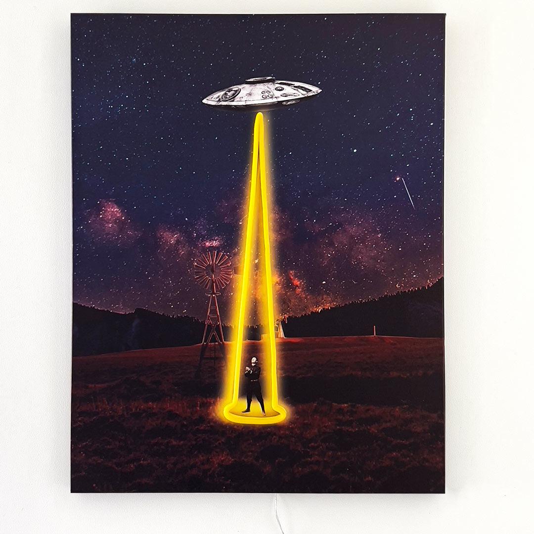 Featuring an original collage design on high-quality printed canvas, this masterpiece is the epitome of artistic expression. The interweaving strands of yellow LED neon are strategically placed, creating a captivating visual tapestry that dances and pulsates like the very stars themselves. The meticulous attention to detail in the composition ensures that your interior space will be adorned with a piece that is truly out of this world.