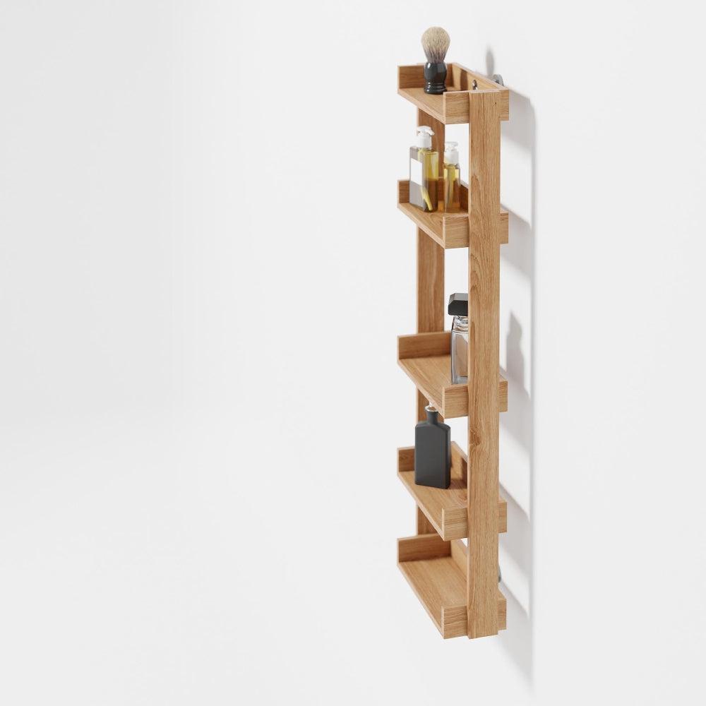 The spacing between shelves is varied making it suitable for both tall and short items. Shelves are open at the front for easy access to your lotions and potions but enclosed on the sides and back to stop things falling off. Fixings appear to float the shelves away from the wall. It's compact size makes it perfect for slim spaces or for a cloakroom.