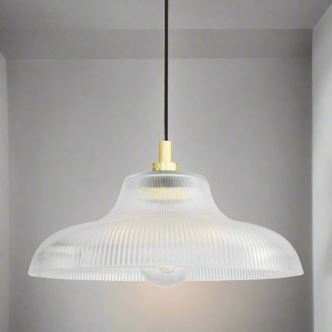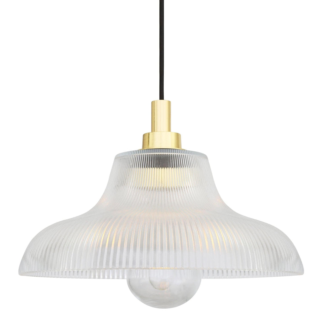 It features a Holophane glass shade attached to a moisture-resistant lamp holder in 2 different sizes and 2 different finishes: Powder coated black & Natural brass.