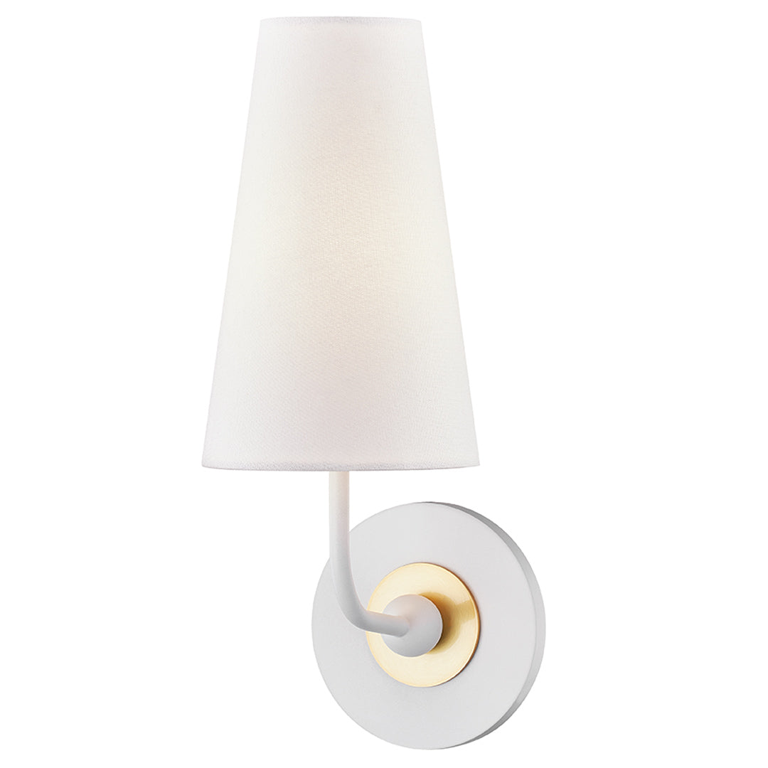 Hudson Valley Lighting's Merri Wall Light adds a touch of luxurious sophistication to any room. The inviting white backplate is graced with aged brass metalwork, curving upwards to a dreamy off-white conical shade that casts a serene glow.