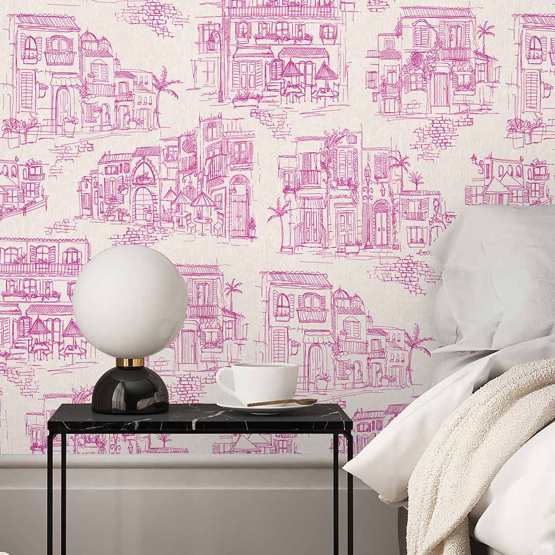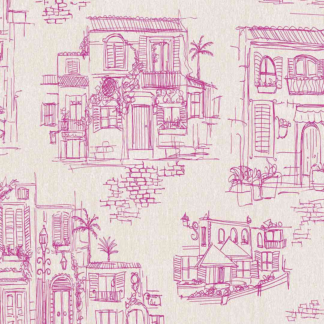 This vintage style wallpaper transports you to the picturesque streets of Europe, evoking memories of a bygone era. With a delicate hand-painted sketch design in vibrant pink, each corner reveals a tapestry of charming eateries and quaint homes. Adding a bold feature wall with. Transform your walls into a work of art with this exclusive Brand McKenzie Wallpaper.