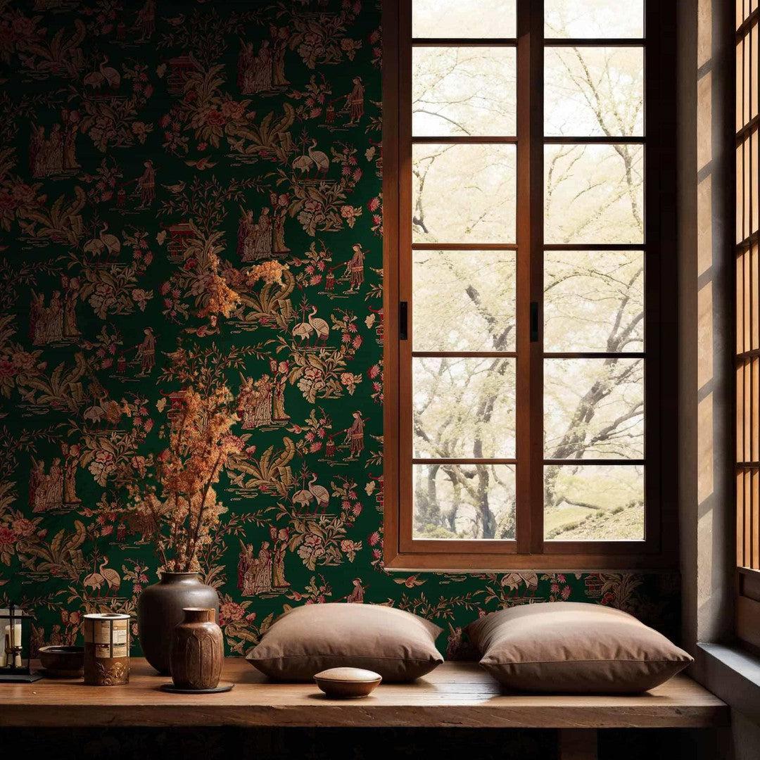 The Tang Walk wallpaper by Coordonné is a breathtaking tribute to the refined elegance of traditional Asian artistry. Featuring intricate scenes of figures in traditional attire, lush botanical details, and graceful animals, this design captures the essence of serene, storied landscapes. The wallpaper is adorned with delicate patterns of foliage, flowers, and architectural elements such as pagodas, which add depth and narrative to the composition. Its intricate detailing evokes the beauty and sophistication of ancient art, transforming any room into a timeless sanctuary.