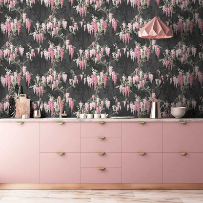 Transform your room into a tranquil oasis with our Wisteria Botanical Wallpaper in Black Noir. As you gaze upon the enchanting nature of this vintage floral design, the lush beauty of the long, trailing scented blooms will transport you to a world of serenity and peace.