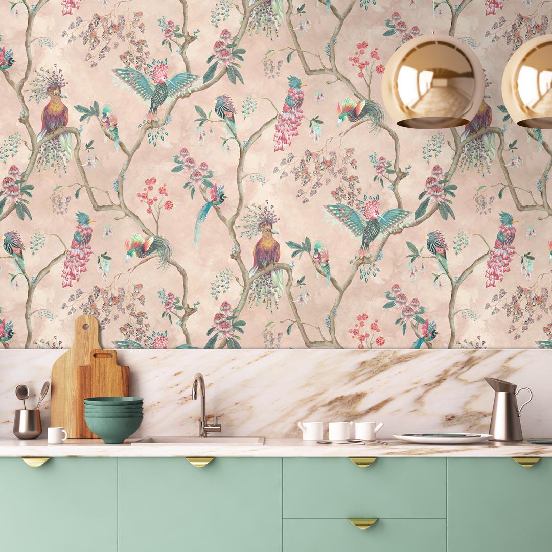 This wallpaper is a playful blend of classic chinoiserie and modern style set against a plaster-hued backdrop. It captures nature's spirit with a lively, contemporary spin. The design's rich details and warm colours invite you into an imaginative and artistic realm.