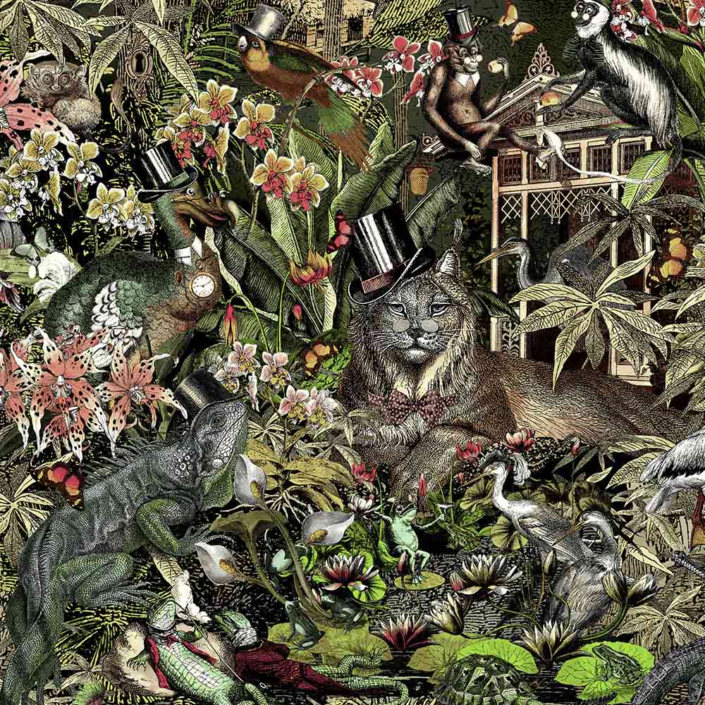 The Jungle Life wallpaper by Brand McKenzie offers a magical journey through lush foliage, where you can watch beautiful safari animals go about their daily lives. This designer wallcovering is a real treat for the eyes, with your attention being drawn to a different detail each time you glance at it. The majestic lion takes centre stage and is surrounded by hand-painted monkeys, lizards, and exotic birds, creating a stunning effect.