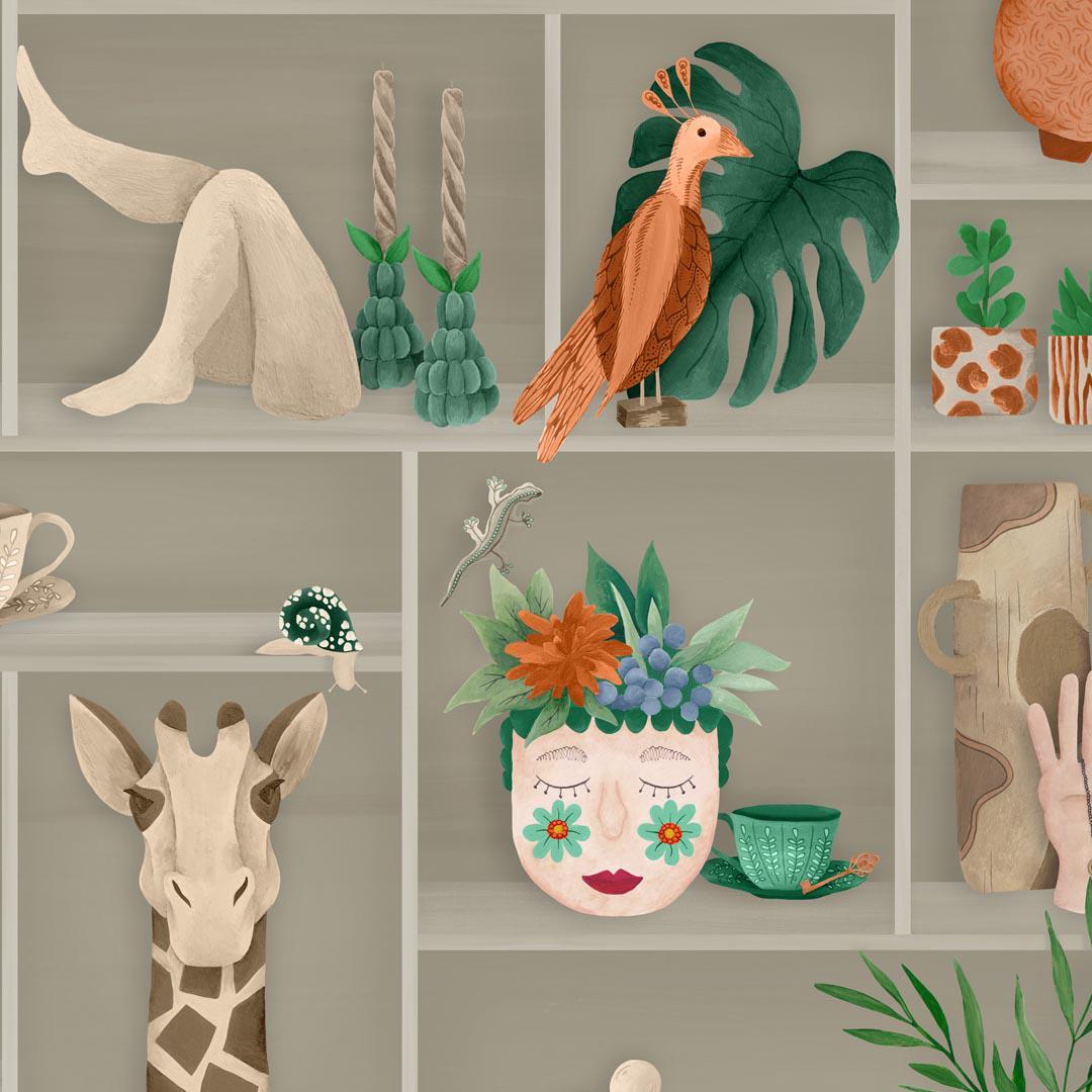 Inspired by the idea of a cabinet of curiosities, this modern wallpaper is a charming celebration of the unusual and the unexpected. Each element of the wallpaper design has been carefully crafted to bring a sense of wonder and intrigue to your walls. Among the treasures on display, you'll find a curious giraffe head peeking out as if observing its surroundings with a touch of mischief. And that's not all - a hand making the playful "OK" gesture adds a dose of humour and whimsy to the overall design.