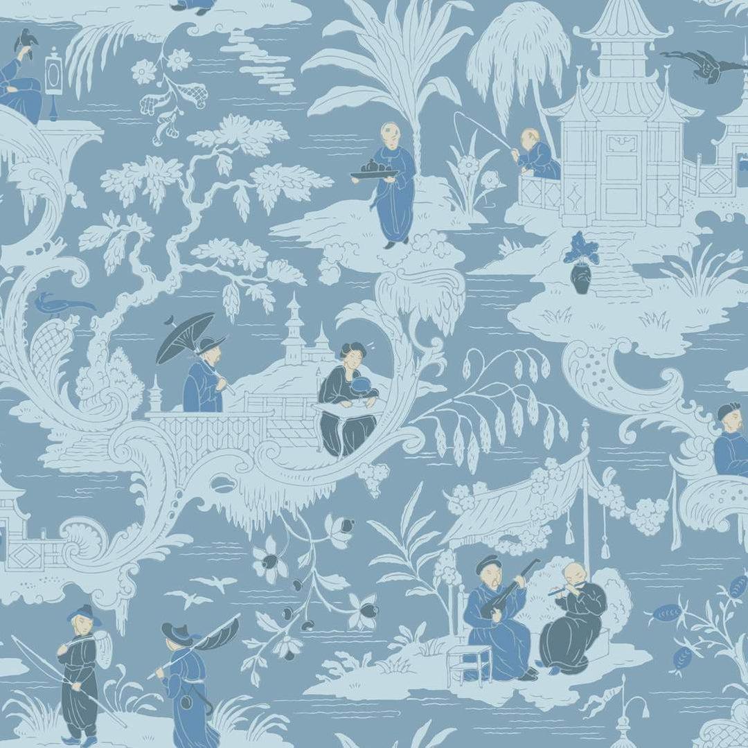 This Orientalist design features pastoral vignettes of Far Eastern life, a style that was immensely popular in Victorian times, brought bang up to date in contemporary hues of Charcoal, Ivory, Chinese Red and Drawing Room Blue.