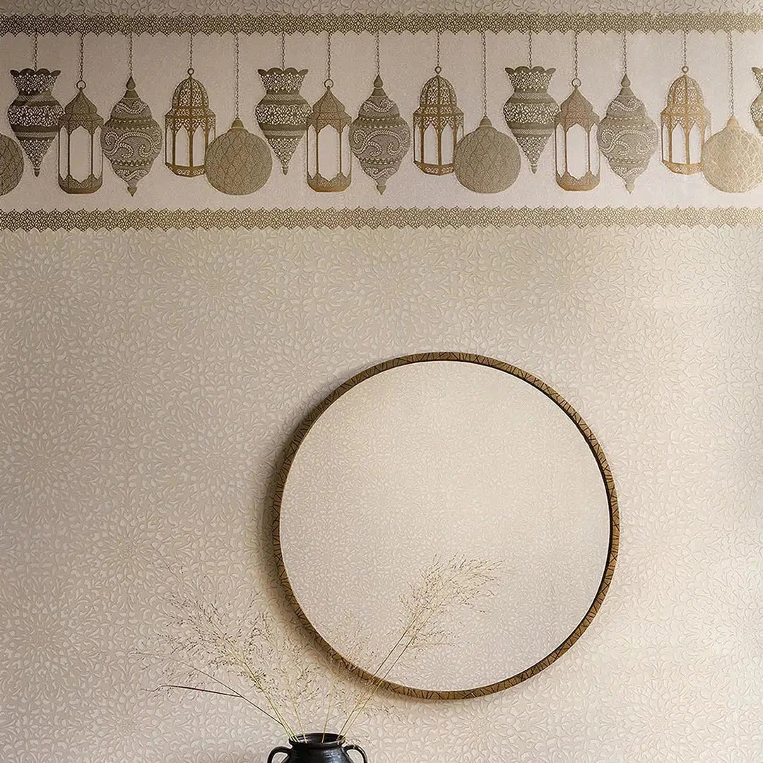 This wallpaper border is designed by Martyn Lawrence Bullard with his signature motif; the Moroccan lantern. Whether planning a soft, faceted interior with Gilver and Parchment, or an enchanting desert night in Silver and Bronze on Charcoal, Fez provides an irresistible, ornate warmth.