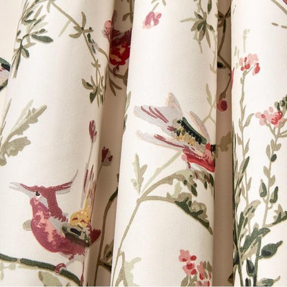 A delicate and romantic floral print, Hummingbirds 100% Cotton fabric depicts delicate birds perched on foliage and flowers.