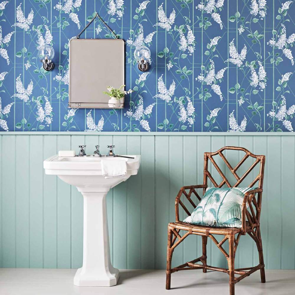 The climbing trail of Wisteria floribunda can be found throughout the Cole & Son archive and this sun-loving, summer bloomer has been updated with a trailing hand-drawn trellis to create a striking graphic print.