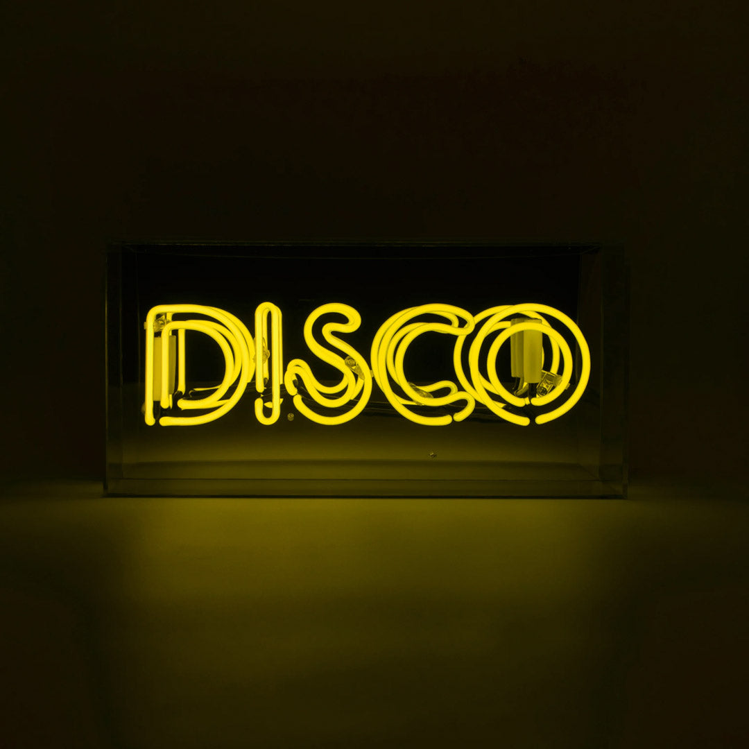 Light up your life with the Disco Neon Acrylic Box Light! This eye-catching and unique yellow light is sure to make a statement in any room. With its vintage-inspired lettering in hand-blown glass neon, it reflects a modern twist on disco-style lighting that will make you want to boogie all night long!