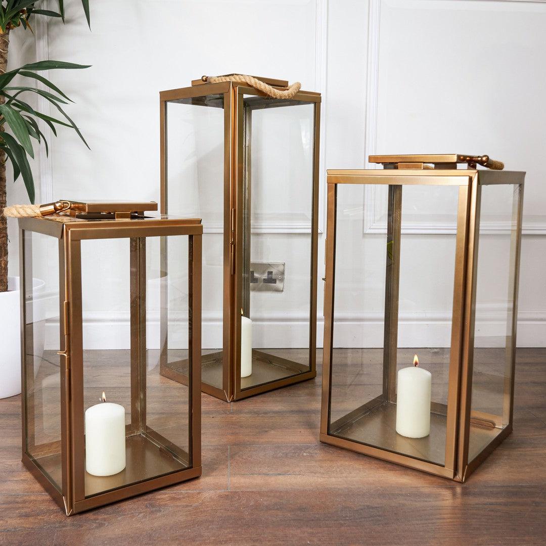 Each lantern is meticulously crafted with glass panels delicately set within the brass frame, creating a seamless blend of materials that enhances its overall aesthetic. The clear glass panels allow for an unobstructed view of the flickering candlelight within, casting a warm and inviting glow that enriches the ambience of any space.