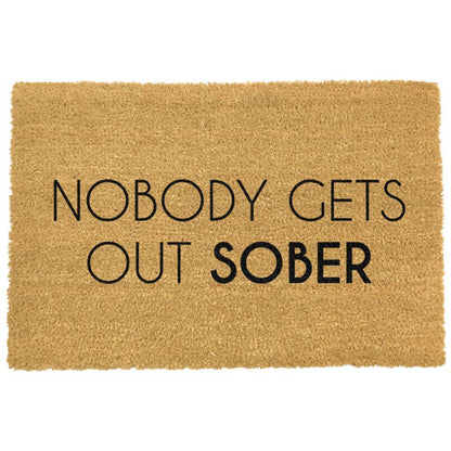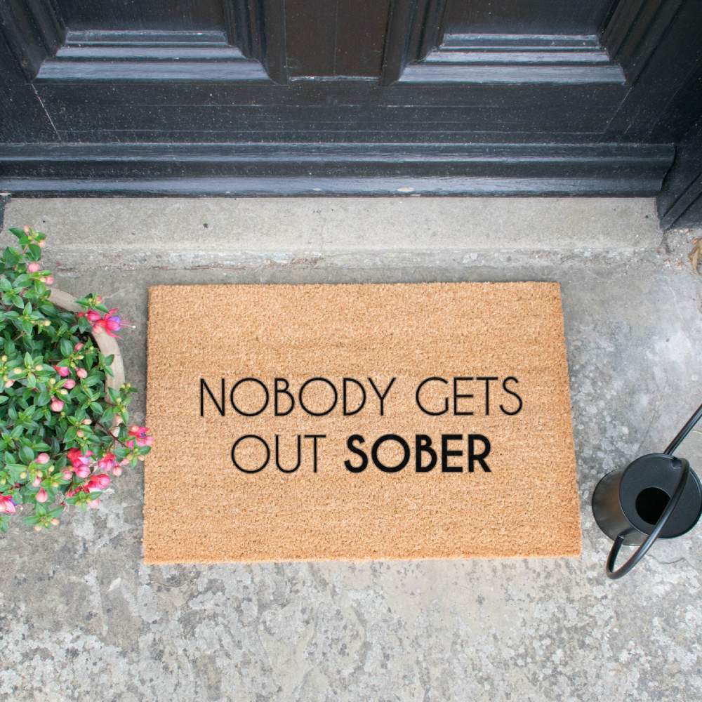 Let your guests know exactly what to expect when they come into your home with this fun doormat with wording 'Nobody Gets Out Sober'. This funky doormat comes with a wonderful simple typography in black print onto sturdy coir.