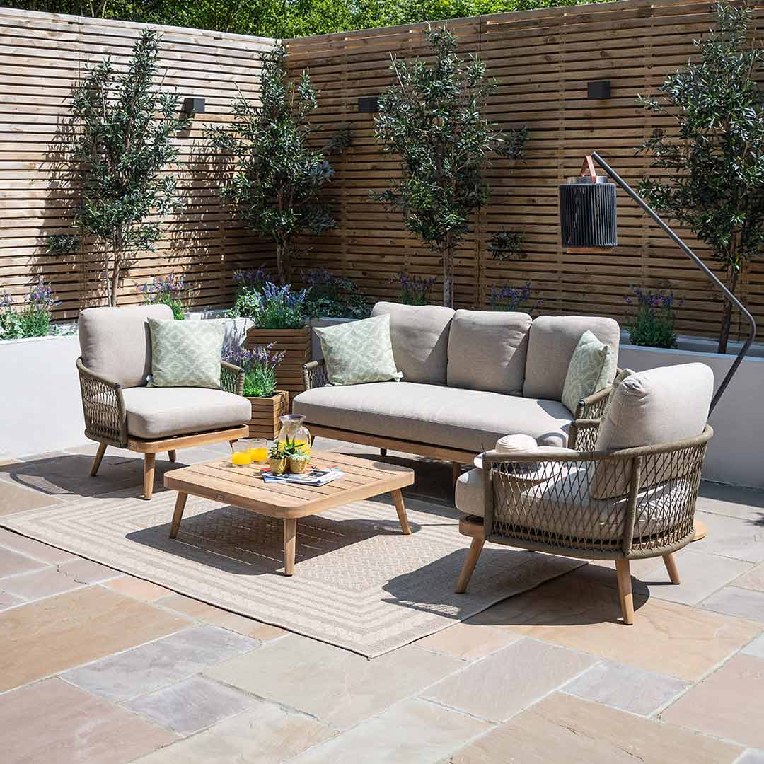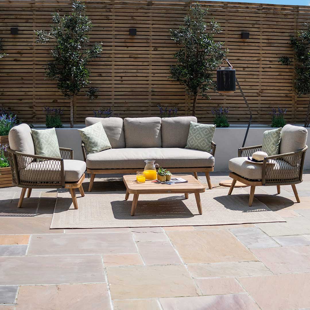 The Maze Bali 3 Seat Lounge Set in Sandstone boasts deep cushions that are not only water repellant but also resistant to the harsh rays of the sun. No need to worry about fading or damage, as this set is built to withstand the elements. Relax and lounge in comfort without any worries.