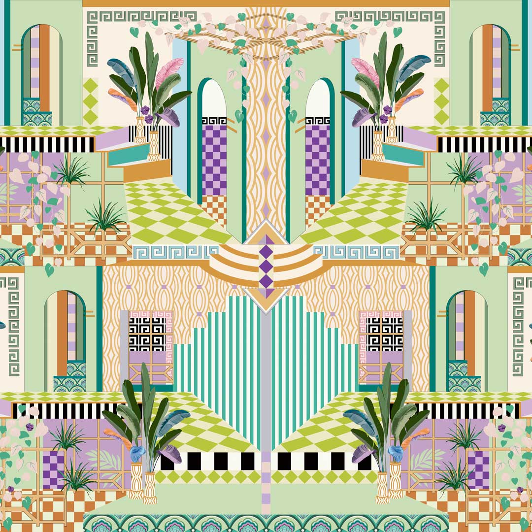 Make a statement with your wall with the Chatelaine Wallpaper! Inspired by the iconic Art Deco era, this architectural wallpaper is a fusion of bold patterns and playful elements that will leave everyone speechless. From arches to plants, stripes to checkerboard, Chatelaine has it all, making it the ultimate maximalist wallpaper design.