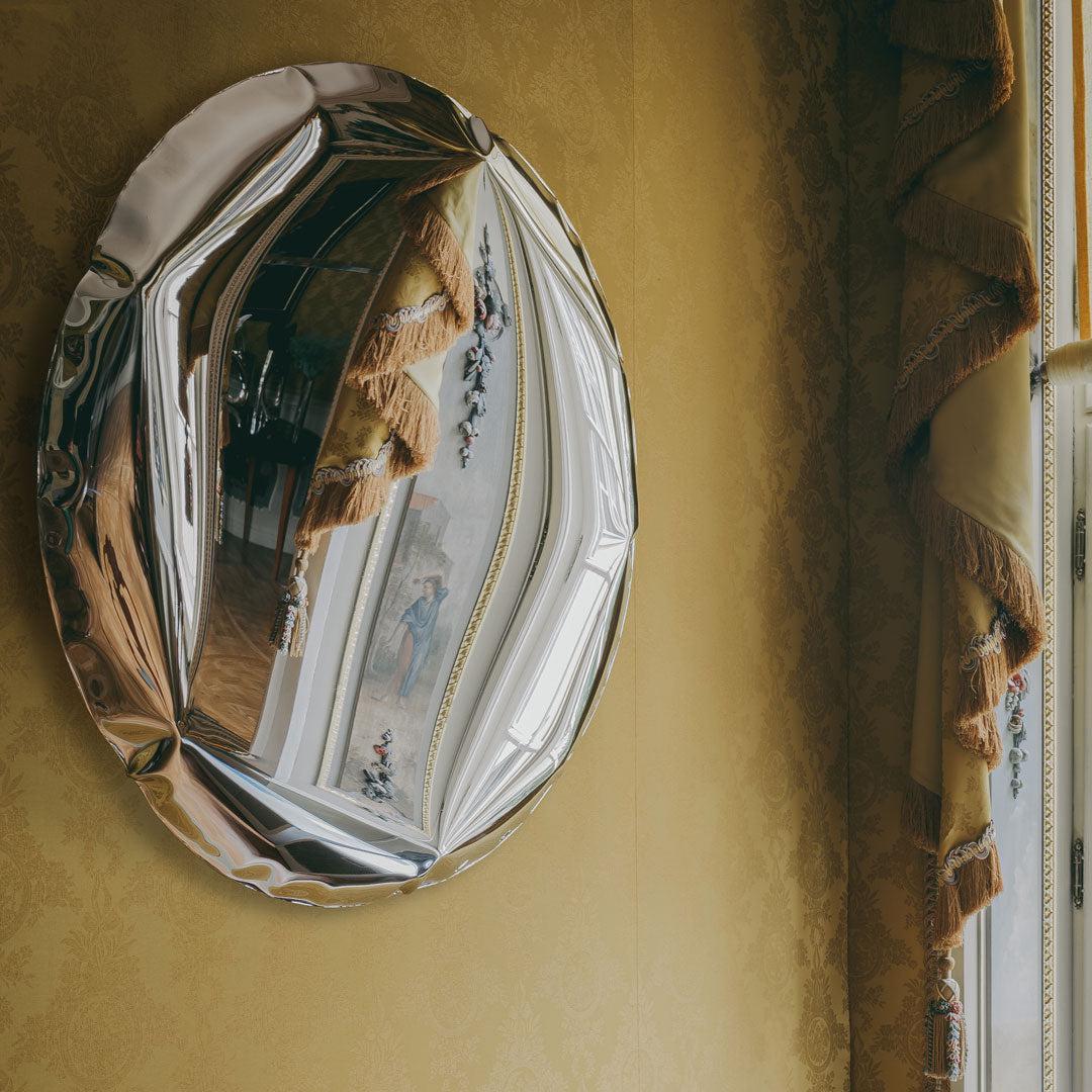 This stylish and unique mirror is made using FiDU technology, where two shapes are cut from steel sheets, welded together around their edges and then inflated into a 3D object.