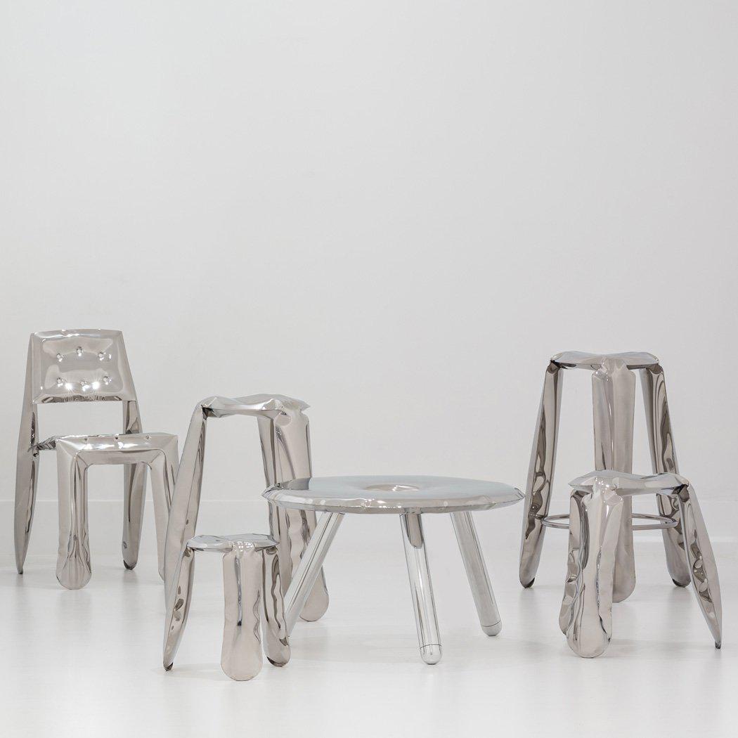 This fun and playful Plopp Bar Stool by Polish designer Oskar Zieta echoes plastic furniture, but as it is made of steel it is light- weight, sturdy and long-lasting. Made using an innovative forming method – FIDU. FIDU technology means that two ultra-thin steel sheets are welded together around their edges and inflated under high pressure to give a 3d object.