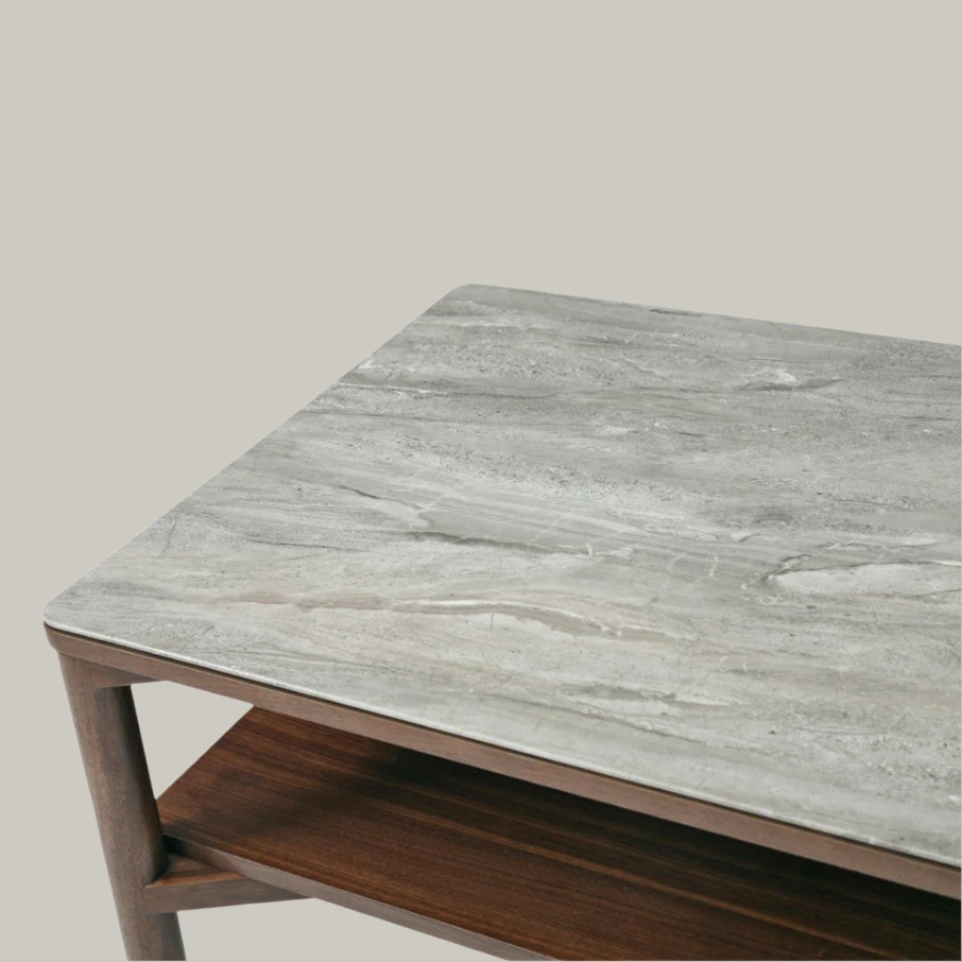 Crafted with a warm tobacco walnut finish, this rectangular coffee table exudes a sense of warmth and sophistication. The rich tones of the wood add a touch of retro charm, while the clean lines and sleek edges give a modern twist. And let's not forget about the eye-catching marbled glass beige top, adding a touch of luxury and refinement to the overall look.