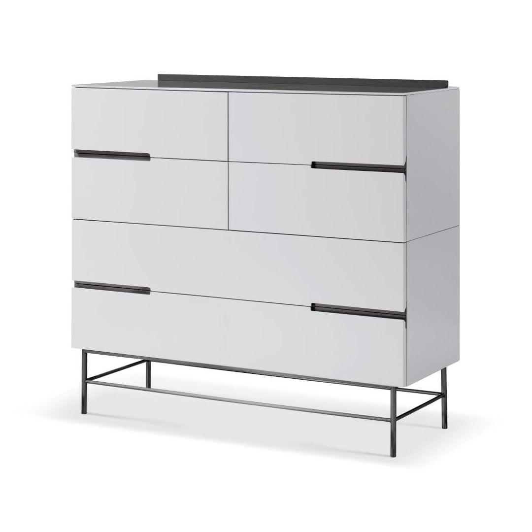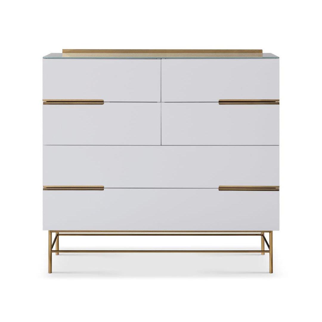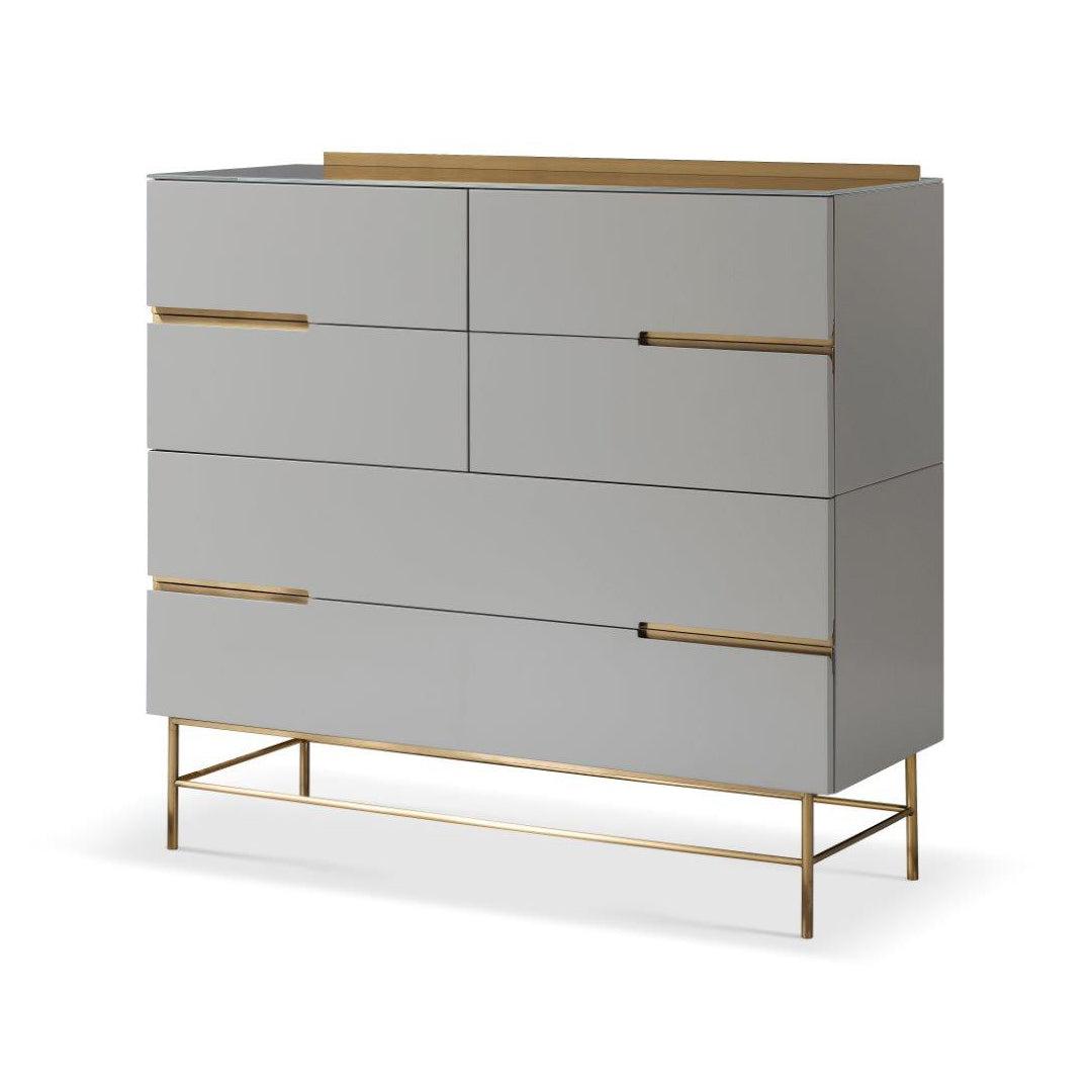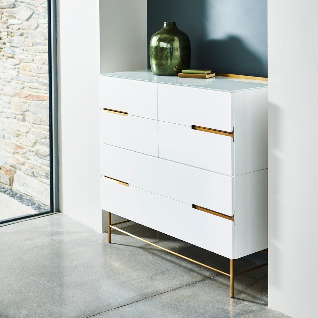 This stylish chest of drawers is a stunning piece of high end designer furniture, with 6 ample drawers and stunning intricate details for extra wow factor. Perfect for use as designer living room furniture, or alternatively as modern and contemporary bedroom furniture. You have a choice of 2 lacquer finishes, and 2 different leg styles, industrial and sleek dark chrome or trendy modern brass.