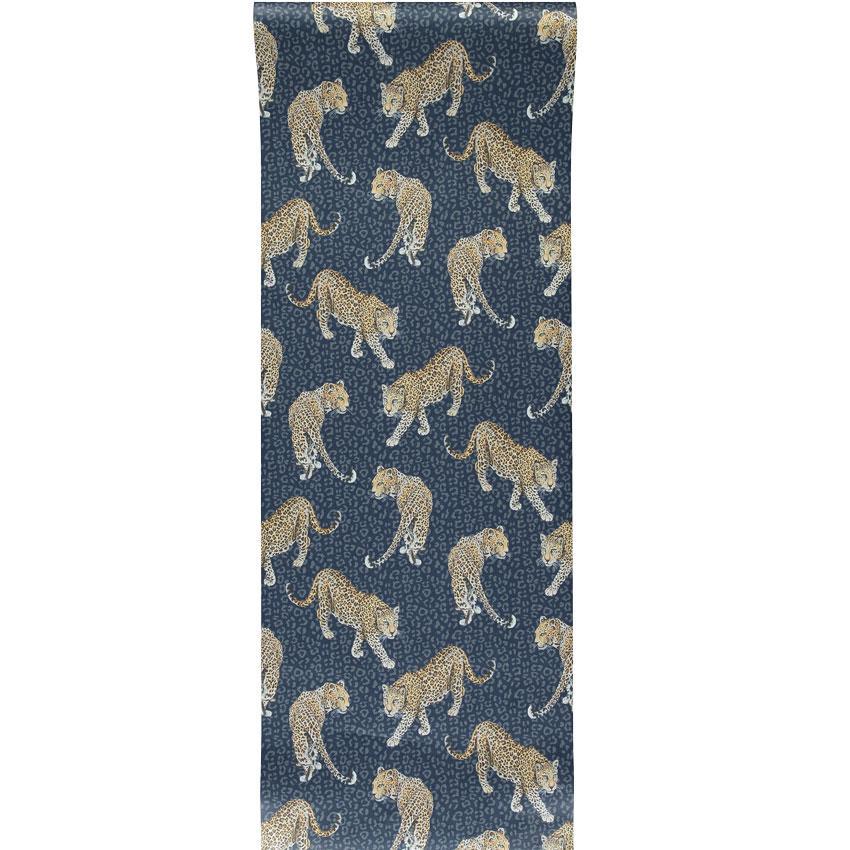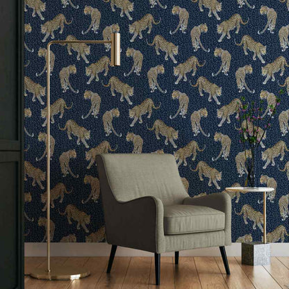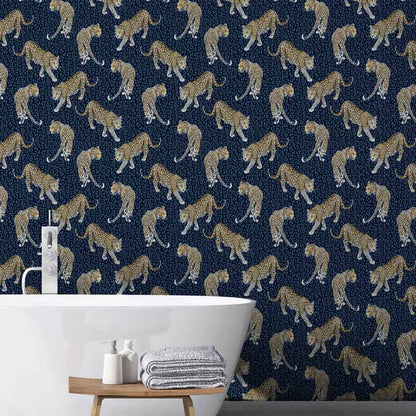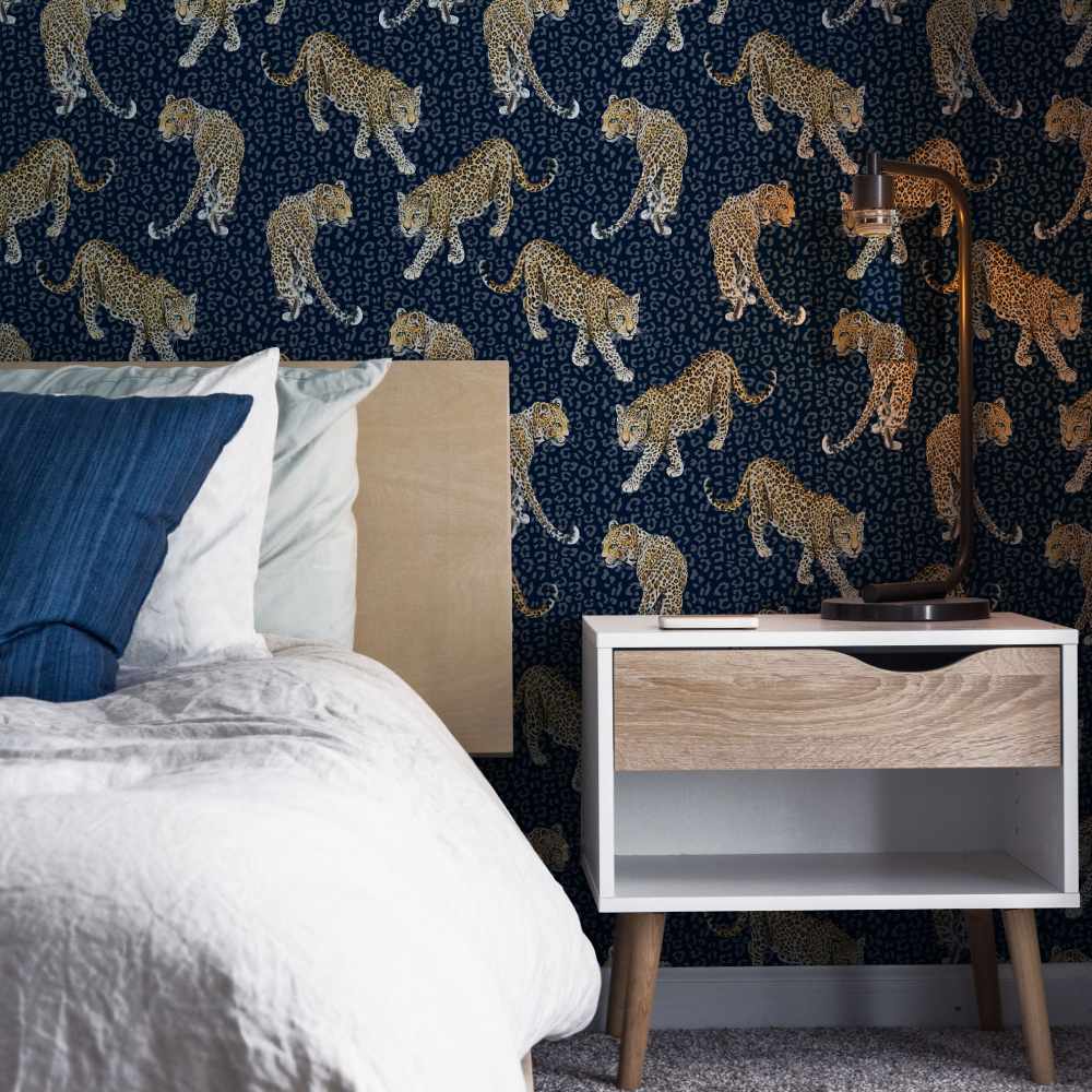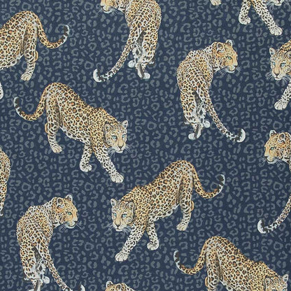 Set on an extraordinary deep blue background, this fabulous All Over Leopard Wallpaper is designed by Abi Bartlett for Graduate Collection. This simple yet striking wallpaper design features beautifully hand painted leopards prowling across a tonal leopard skin background in a dramatic blue colourway.