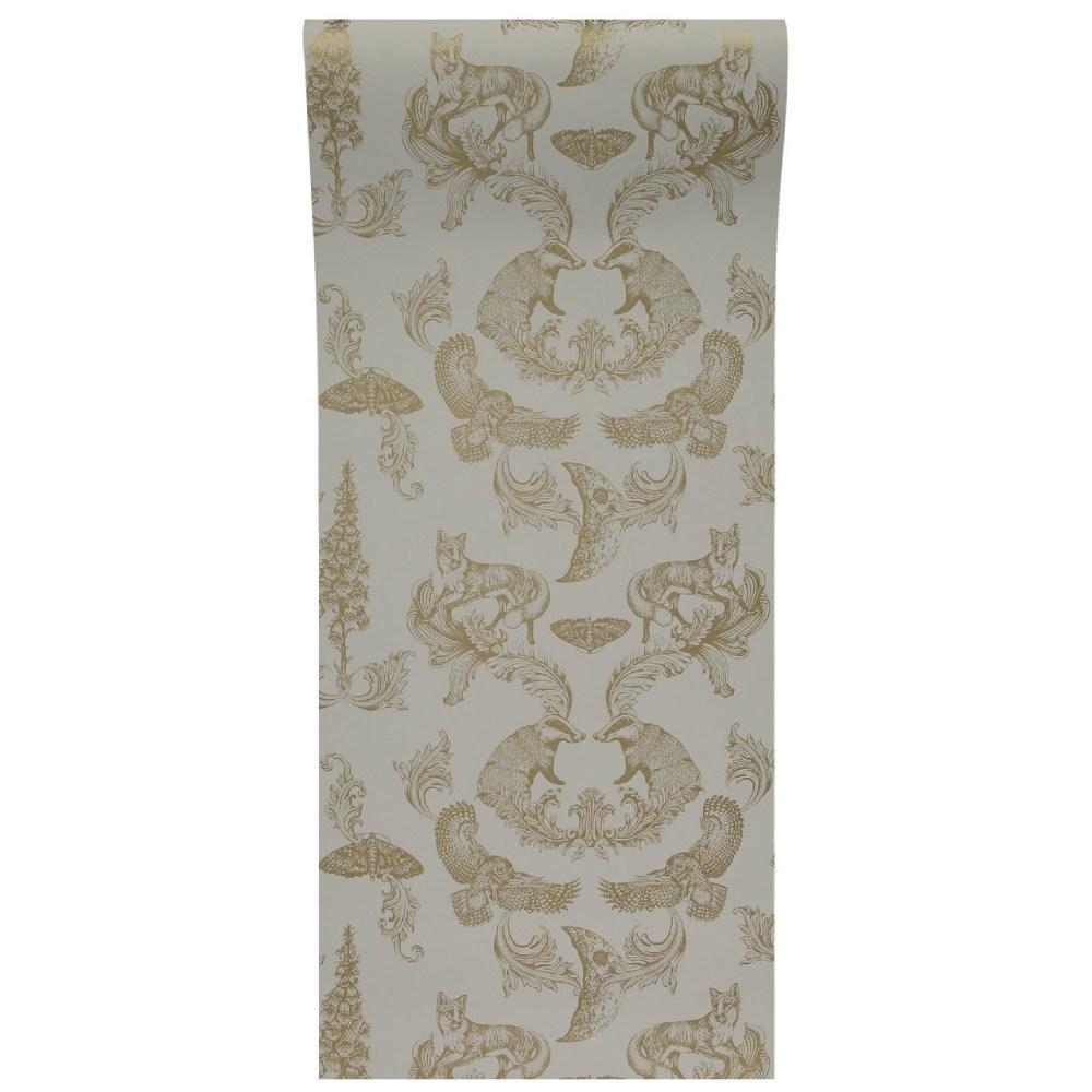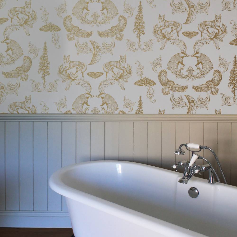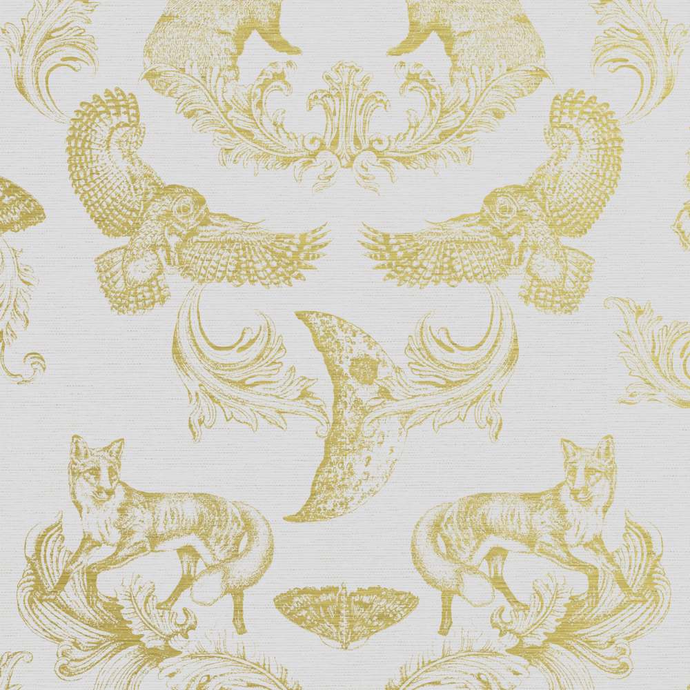 It features charming hand drawn illustrations of whimsical woodland creatures. Beneath a shimmering metallic golden moon you'll find badgers, foxes and birds nestled amidst the forest foliage. Set upon a light cream background, this stylish and sophisticated wallpaper is a modern and contemporary twist on the traditional damask style.