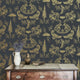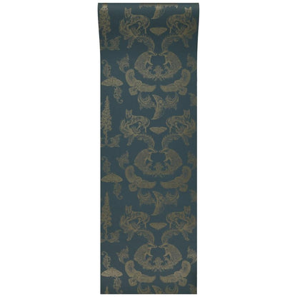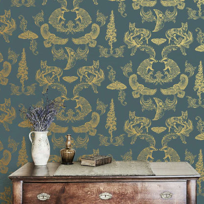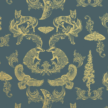 It features charming hand drawn illustrations of whimsical woodland creatures. Beneath a shimmering metallic golden moon you'll find badgers, foxes and birds nestled amidst the forest foliage. Set upon an inky teal background, this stylish and sophisticated wallpaper is a modern and contemporary twist on the traditional damask style.