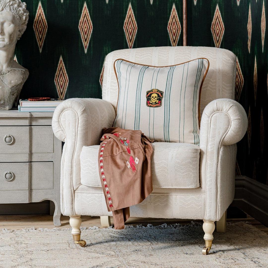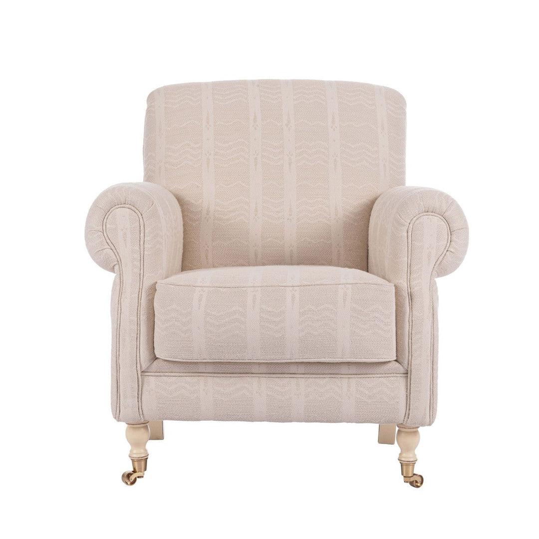 The Kingston Chair upholstered Whitelake Jacquard woven fabric from Mind The Gap is a beautifully designed and extremely comfortable chair that is perfect for any home. With its slightly sloping open back, large rollover arms and fluffy comfortable seater, this neutral colour armchair provides the perfect place to relax in style.