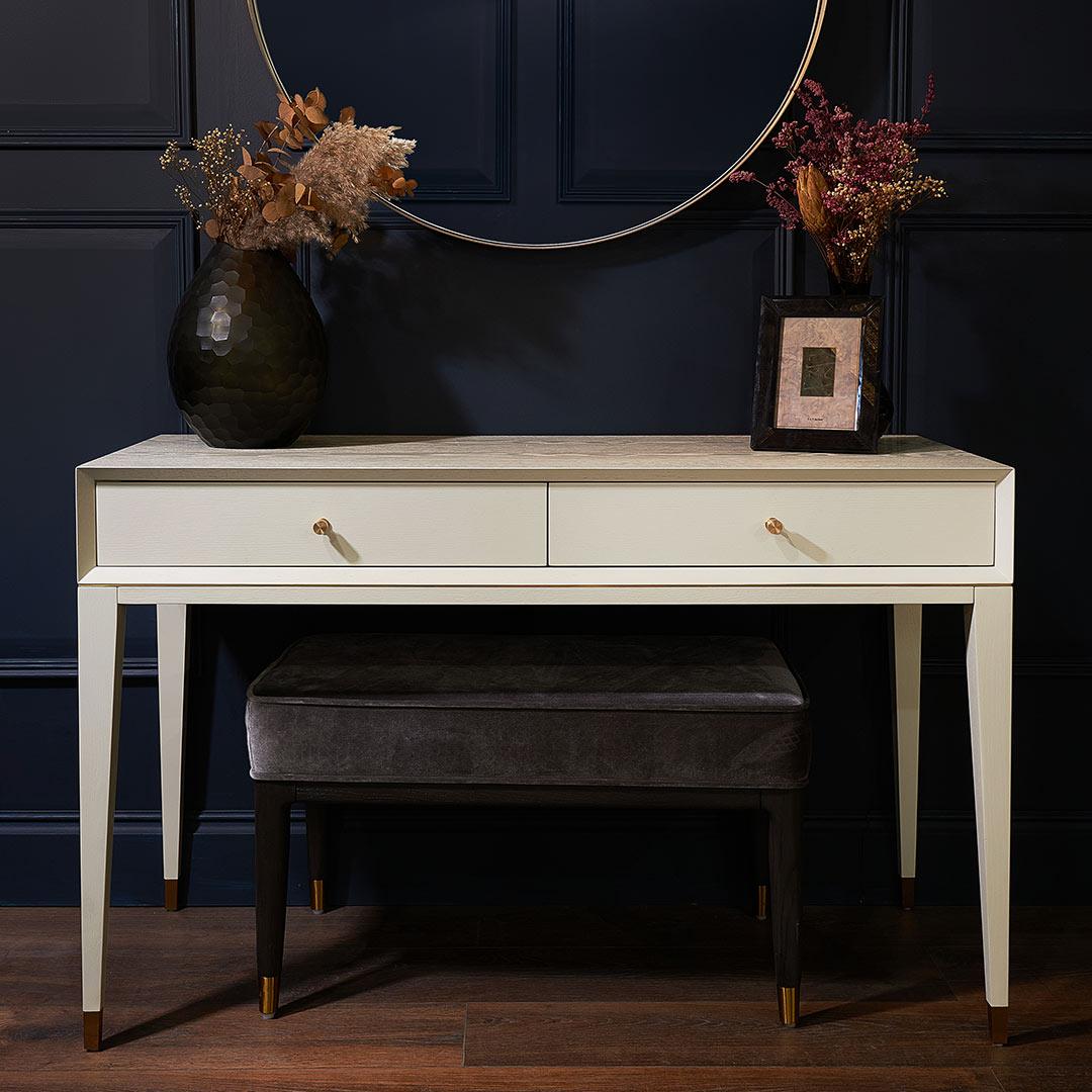 Introducing the Bayeux White Dressing Table by RV Astley, the perfect piece of furniture to bring a touch of elegance and luxury to any room. This statement-making dressing table is anything but ordinary. Crafted with white veneer and finished with beautiful brushed gold trim and handles, it stands out from the pack and demands attention. The timeless white hue and gold finery combine to create a look that’s chic and glamorous.
