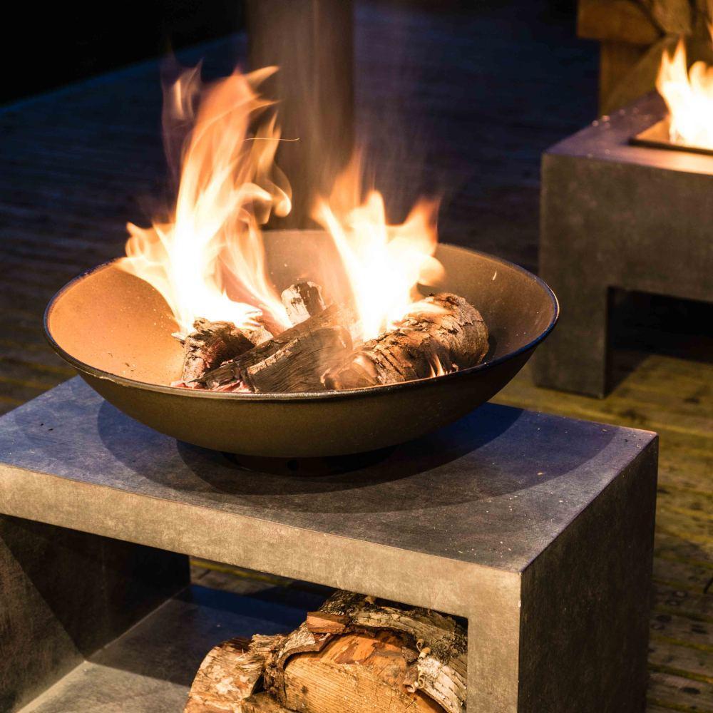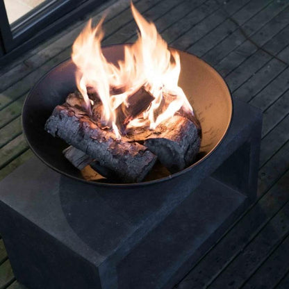 This chunky, industrial style modern iron and fibrestone fire bowl comes with a Granite effect base.