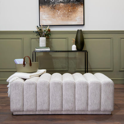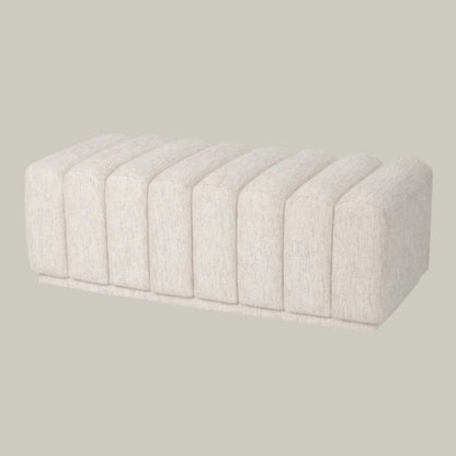 The Konya Ottoman is a chic and versatile addition that enhances comfort and texture in any living space. Upholstered in a luxurious cream boucle, it features a soft, inviting surface with a distinctive channel-tufted design, giving it a modern, sculptural aesthetic. Its plush upholstery offers a cosy spot to sit or rest your feet, while its elongated shape makes it ideal as an alternative coffee table, extra seating, or as a footrest at the end of a bed. The cream boucle fabric adds warmth and tactile quality, making the Konya Ottoman a stylish and functional choice for any contemporary or transitional home.
