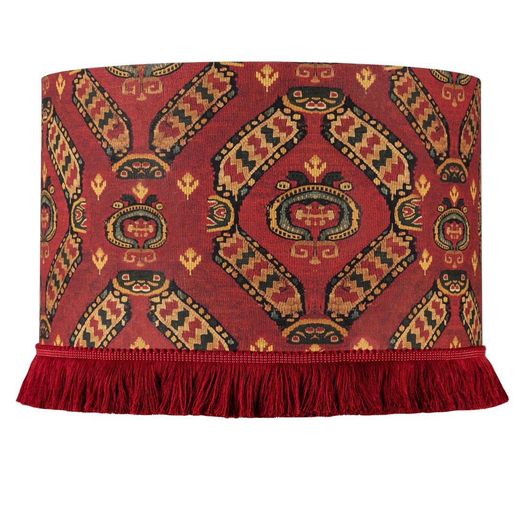 Make a statement with the stunning Rovereto Lampshade. Drawing inspiration from the city and commune of Rovereto in Northern Italy, this stately shade is sure to capture attention. Have guests marvel at its deep red and gold panels, stylish zig zag pattern, and metallic gold lining, all finished off with soft red fringing for an even more elegant look.