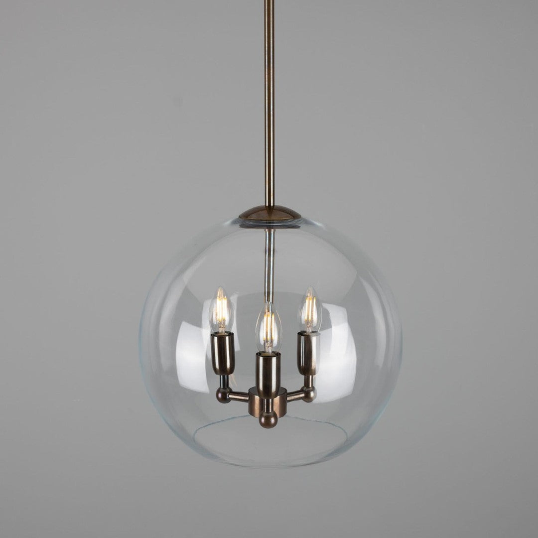 Crafted with three brass arms elegantly centred in the glass globe, this chandelier perfectly blends classic and contemporary styles. The antique brass and polished brass finish options add a luxurious touch, making it a statement piece that will enhance the overall aesthetic of your space.