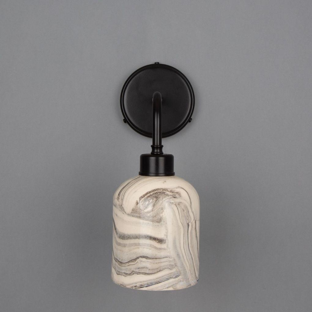 Supported by a stylish curved matte black powder coated arm, the Osier ceramic wall light bears an elegant design. The multi-toned marble effect that runs across the smooth glazed ceramic shade brings an edgy industrial sense to this charming wall lamp.