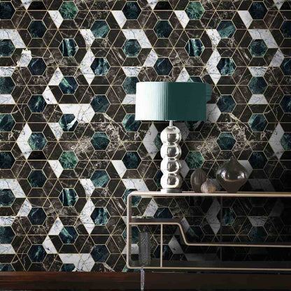 The striking Hexa Jade Wallpaper by designer MINDTHEGAP is an opulent geometric design and sure to bring a glamorous feel to your space.