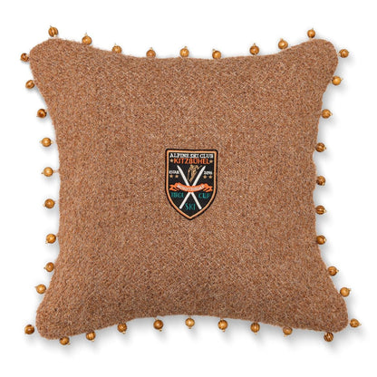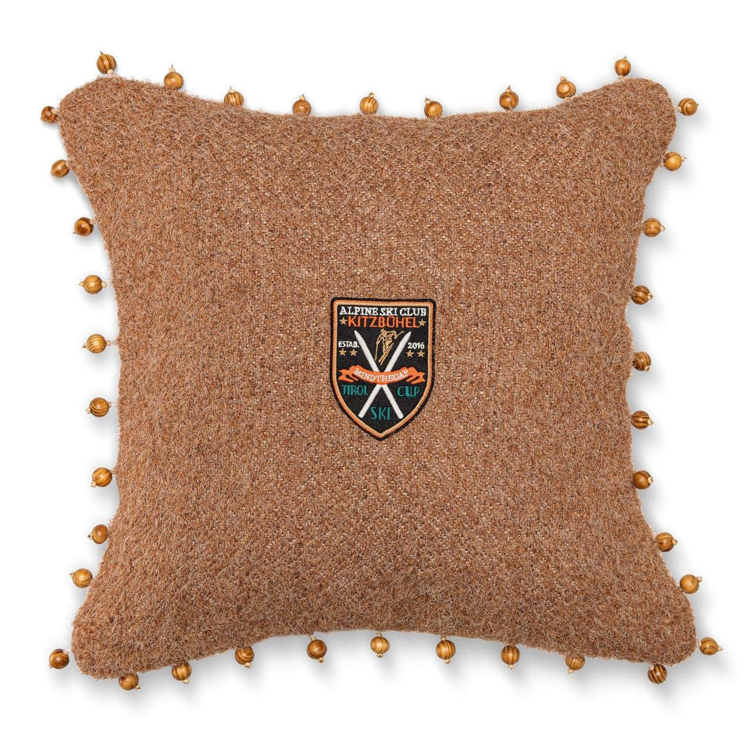 Introducing the Alpine Ski Cushion from Mind The Gap. If you’re looking for a unique cushion with a rustic yet sophisticated feel, then this one is for you. It’s sewn from cosy brown DECKE fabric and finished with an embroidered patch and playful wooden balls as trim - the perfect combination of style and humour.