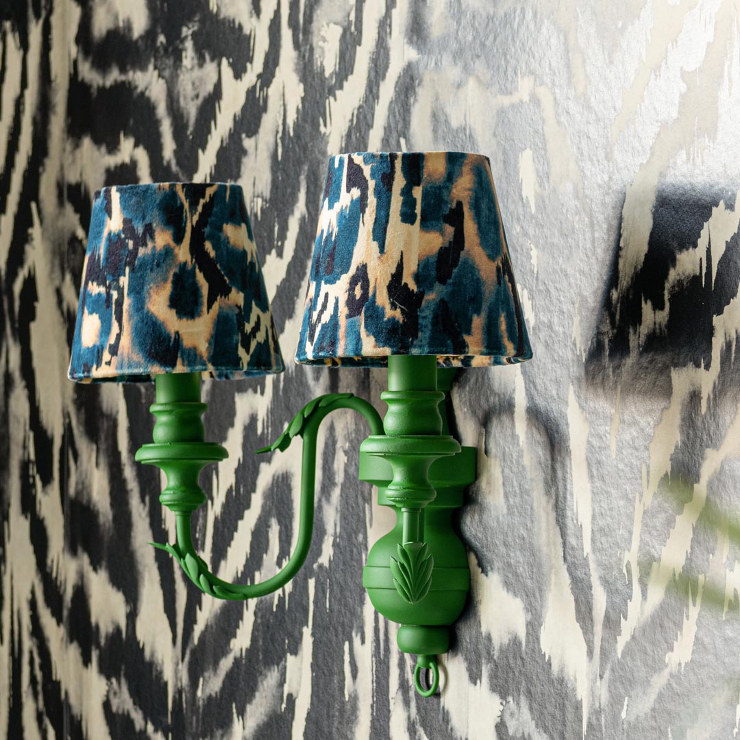 You can choose to buy this green wall light as is, with its sleek double arm design, or you can take it up a notch by adding the stunning Blu Selvaggio lamp shades. These contemporary shades feature a mesmerizing animal print in shades of royal navy blue, white, and black, brimming with untamed elegance.