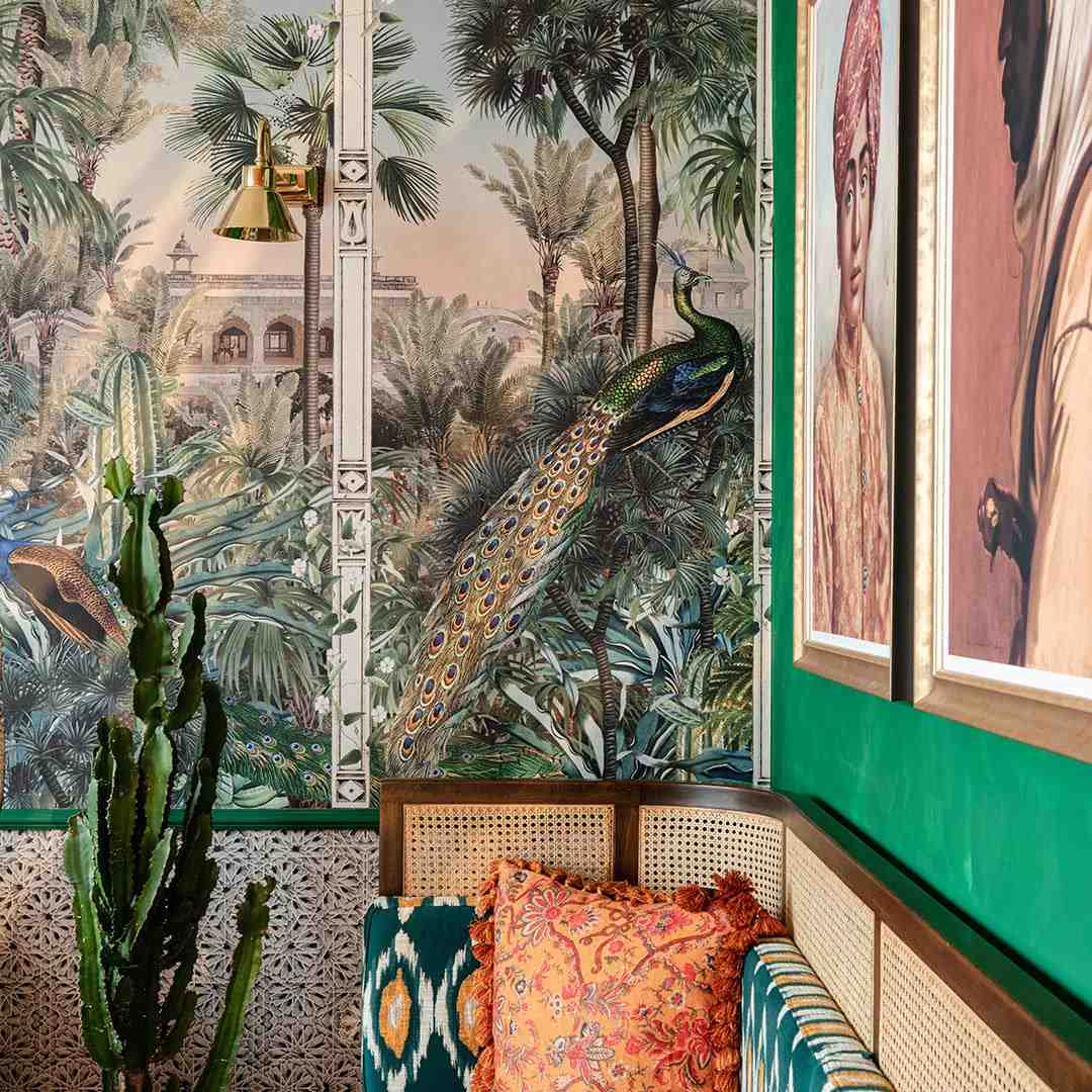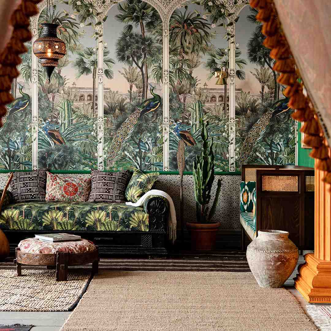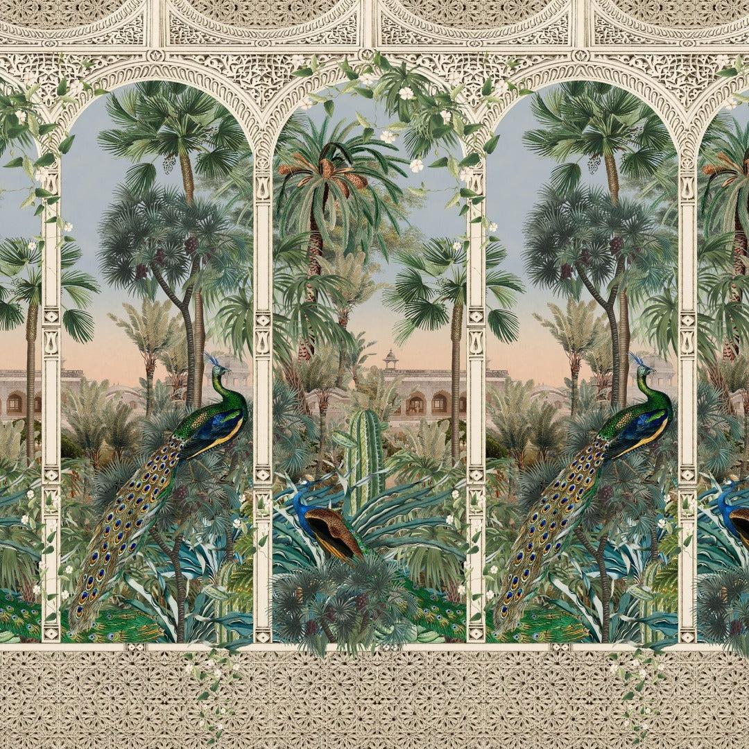 Featuring a breath-taking view of lush gardens, arches and palms, the Erfoud wallpaper from MINDTHEGAP is sure to transform any space – whether your bedroom, living room or hallway. This restorative design is inspired by the Oasis town in Morocco’s Sahara Desert and captures a delicate blend of nature and architecture integrated with beautiful pastel blue and pink hues.