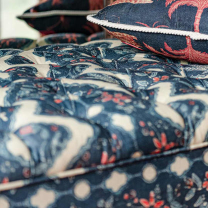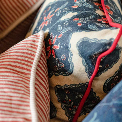 Breathe new life to your designs! Introducing Phoenicia Batik 100% Linen Fabric by MINDTHEGAP- your dream of creating an exquisite yet naturally stylish space becomes a reality. The perfect marriage of warm Mediterranean spirit and beautiful modern design, this fabric is both timeless and chic. Crafted with natural linen, it boasts a mesmerizing symmetrical pattern of shapes and colours enhanced in shades of deep blue and dark red with beautiful ornamental motifs inspired by the sun-scorched Aegean culture.