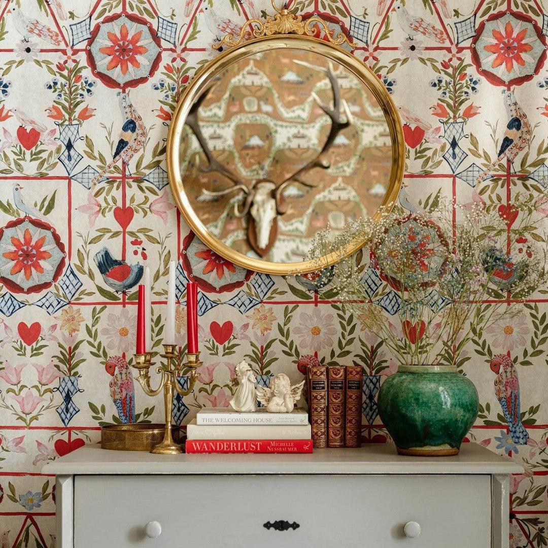 Introducing The Bird House Wallpaper by MINDTHEGAP, perfect for adding a touch of sophistication to any interior. With its intricate grid inspired by the grandeur of a vintage aviary, this stunning wallpaper design features a charming flock of birds swooping down from the majestic Tyrolean mountains.