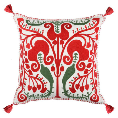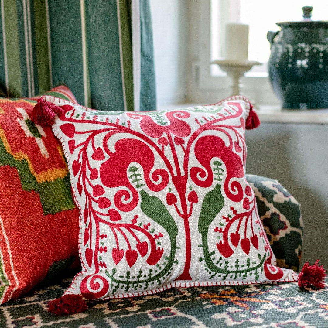 Bring a burst of Hungarian spirit into your home with the Transylvanian Suzani Linen Embroidered Cushion by Mind The Gap! This cushion is genuinely exquisite, boasting vibrant full-face quilting on the front that showcases a beautiful handmade floral design.