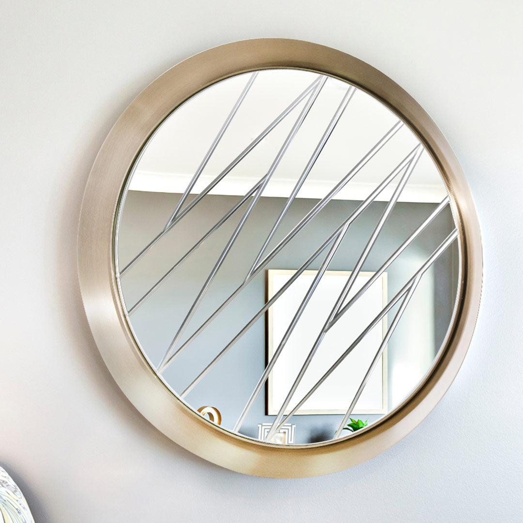 Introducing the Vienne Mirror by RV Astley - a one-of-a-kind statement piece that is sure to add unique style and class to any room! This modern round mirror features a premium brass frame with v-groove detailing in the form of an intricate zigzag pattern on the glass. With its modern style and eye-catching design, this exceptional mirror will be the conversation piece of your home.