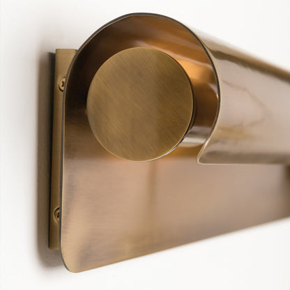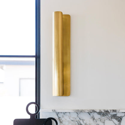 Sleek and simple yet with a fanciful flair, this brass wall light is a true statement piece that will elevate the aesthetic of any room it graces. The light's folded metal design gives it a unique and eye-catching shape, making it not just a source of light but also a work of art in itself.