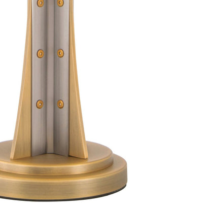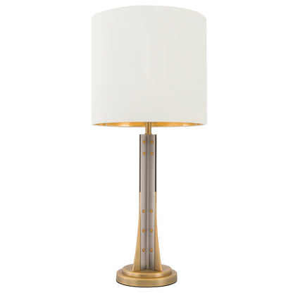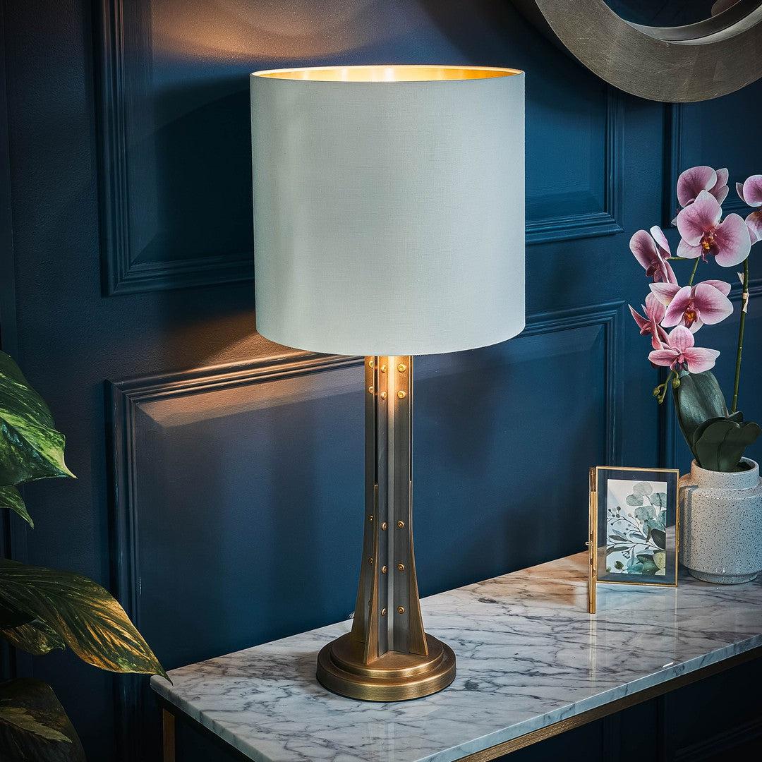 The Enoch Table Lamp by RV Astley is a striking tribute to industrial design, bringing a bold and masculine edge to any interior. Its standout base features an intricate mix of antique brass and pale gunmetal finishes, creating a dynamic contrast that exudes rugged sophistication. This distinctive combination adds depth and character, making the lamp a focal point in any space.