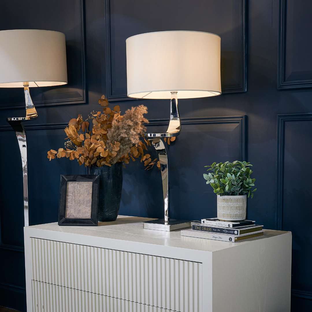 RV Astley add to their collection of stylish lighting with the Enzo Table Lamp. This nickel lamp is a perfect example of modern living lighting, with the sculptural shape and trendy soft brown shade making it a go to contemporary light fitting. This range of designer lighting is designed in the UK and intended to fit in all rooms of your interior setting. Place in the living room to make a statement, or pair either side of a bedroom for mood lighting and ambience, the choice is yours.