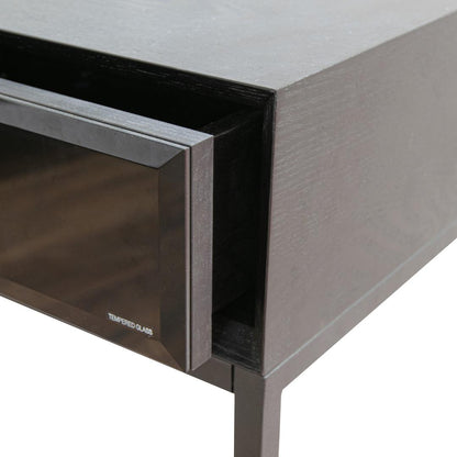 The Finola Console Table by RV Astley is designed to add drama and depth to any space, making it a striking focal point in any interior. The black veneer top offers a bold, sophisticated touch, while the sleek, tapered metal legs introduce an element of lightness and elegance, creating a perfectly balanced frame.