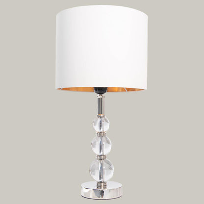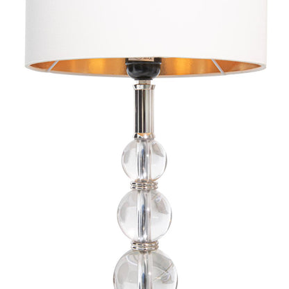 A series of stacked crystal spheres serves as the lamp’s standout feature, adding a luxurious, refined touch to its slender profile. These clear, spherical accents contrast beautifully with the nickel base, creating an eye-catching interplay of light and metallic elements.