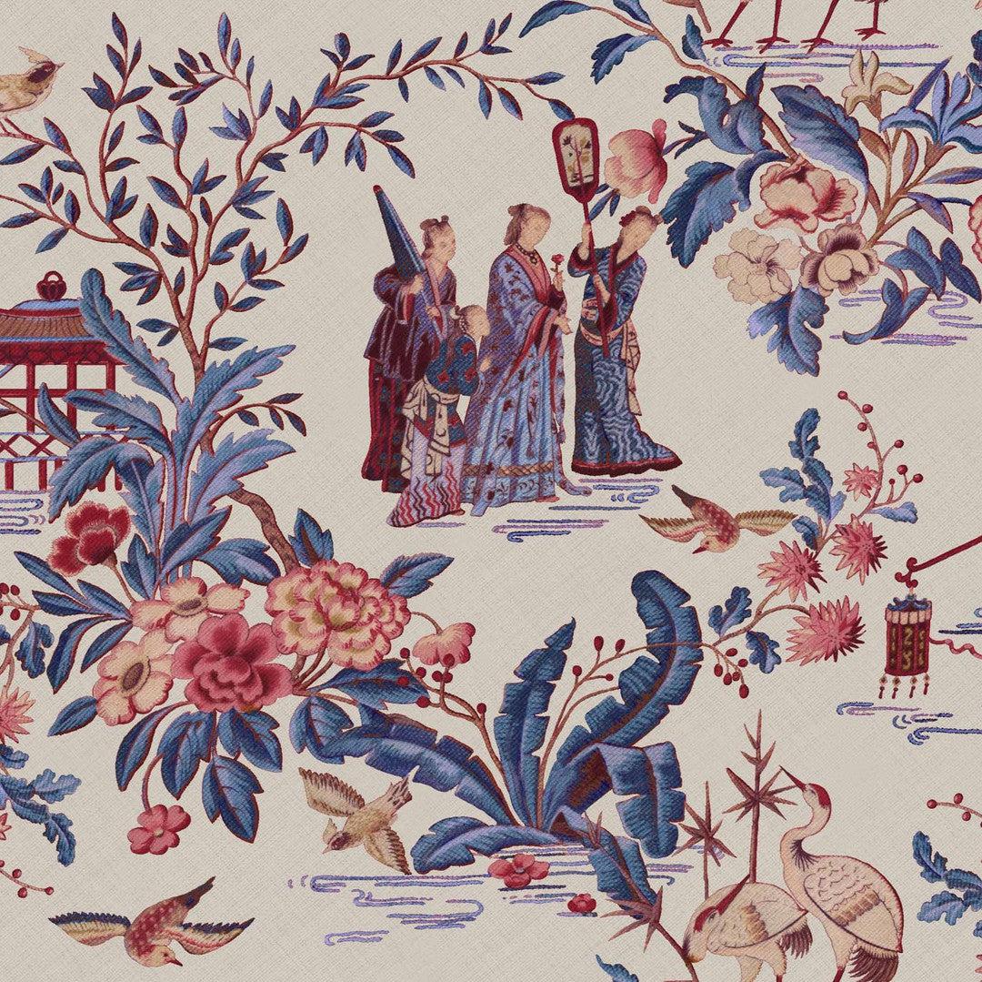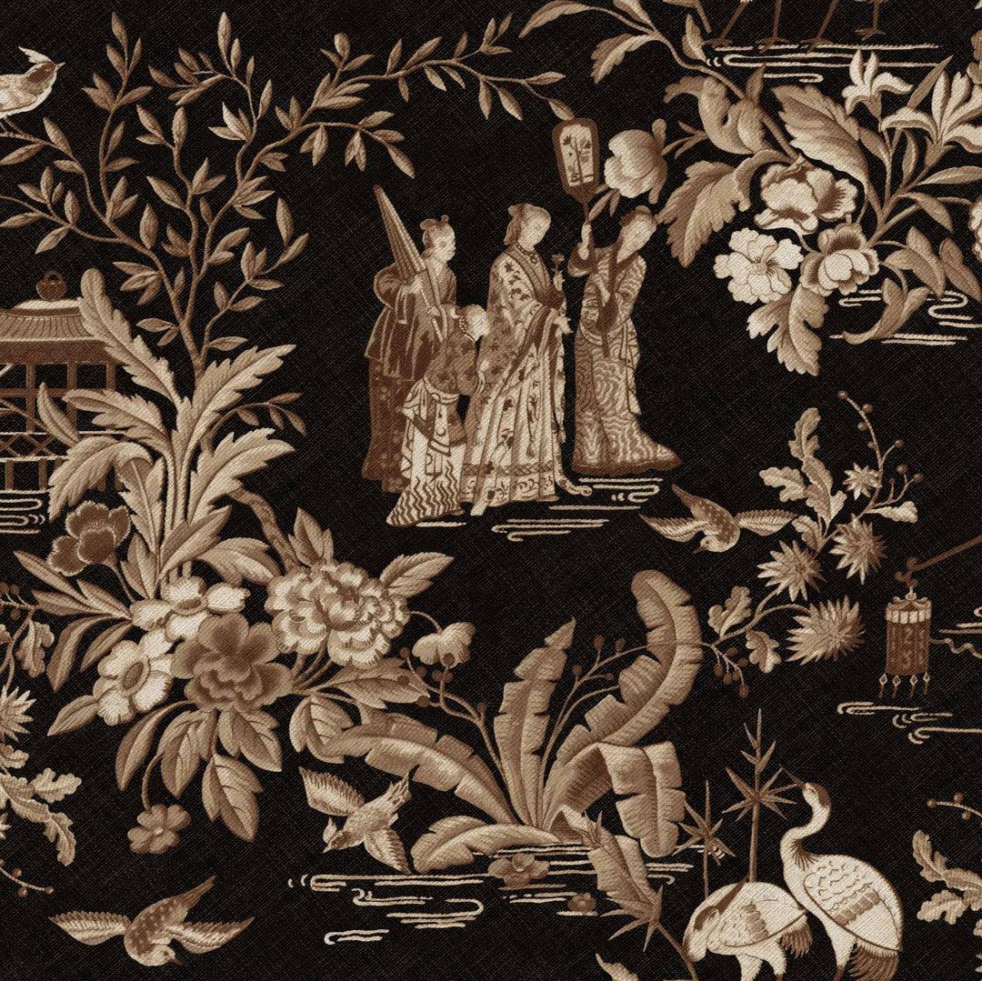 The Tang Walk wallpaper by Coordonné is a breathtaking tribute to the refined elegance of traditional Asian artistry. Featuring intricate scenes of figures in traditional attire, lush botanical details, and graceful animals, this design captures the essence of serene, storied landscapes. The wallpaper is adorned with delicate patterns of foliage, flowers, and architectural elements such as pagodas, which add depth and narrative to the composition. Its intricate detailing evokes the beauty and sophistication of ancient art, transforming any room into a timeless sanctuary.