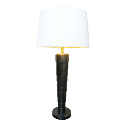 The Taurus Table Lamp Base by RV Astley combines bold design with modern sophistication, offering a striking foundation for any interior space. Crafted with a black antique bronze finish, its sculptural silhouette features a distinctive tiered, stacked column design that adds depth and texture to the piece. This dynamic structure is anchored by a sleek, circular base, providing stability and balance while enhancing its visual appeal.