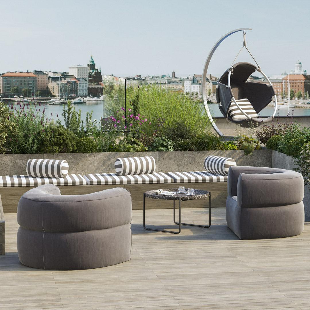 Filled with EPS beads and featuring two filling chambers, the innovative design allows for personalized softness in both the seat and armrests. Crafted from eco-friendly Crevin fabric made with 40% recycled fibres, this chair is not only a sustainable choice for outdoor furniture but also produced in the EU, reducing TRIMM Copenhagen's carbon footprint.