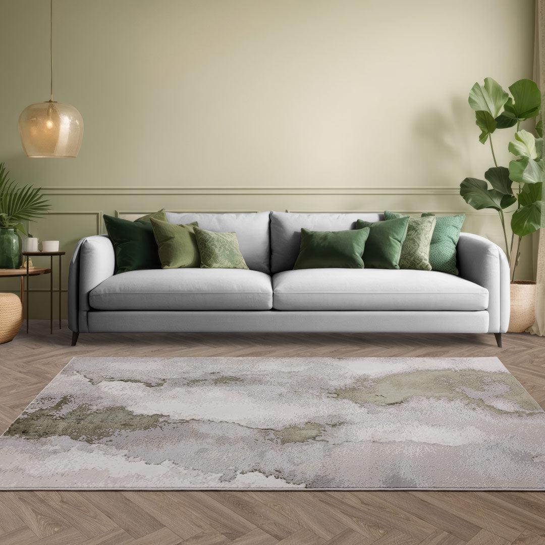 The Celest Premium Lustrous Abstract Rug in Green is the perfect addition to your contemporary living space. Inspired by the beauty of watercolour brushstrokes, this rug will add a touch of artistic elegance to your home. Crafted with meticulous attention to detail, it boasts a striking abstract pattern in muted earth tones of grey, taupe, and sage green, designed to soothe your senses and bring a sense of calm to any room.